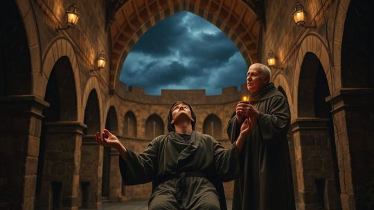 Num mosteiro antigo, cercado por muralhas cobertas de hera e pelo rumor das montanhas, vivia Miguel, um jovem noviço com o coração apertado por uma inquietação que não sabia nomear. Ele vigiava as horas com zelo, contava os passos pelos corredores...