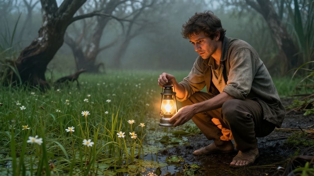 O pântano murmurava como um escritório depois do expediente: rãs em coro lembrando notificações, juncos que se enroscavam como prazos e metas, e uma névoa que imitava a confusão das opiniões alheias. Tomás caminhava por ali, os sapatos bebendo água e o coração pesado, como quem carrega um crachá sem saber para quê. Na mão, ele levava uma Lanterna desligada — presente do avô — que sempre o acompanhava, mas que ele raramente acendia. Dentro dele, uma pergunta persistia, como um mosquito que não se espanta: q para que serve meu trabalho, afinal? q