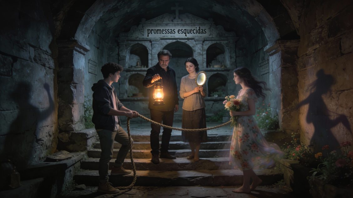 Não desciam para visitar lápides, mas símbolos: nichos onde jaziam promessas esquecidas e laços empoeirados. João acendeu uma lâmpada de óleo chamada Confiança. Maria abriu um pequeno espelho chamado Escuta. Carlos apertou uma corda batizada de Coragem, e Ana trouxe flores que ela nomeou Esperança. As paredes, cobertas de inscrições, sussurravam como uma catequese silenciosa.