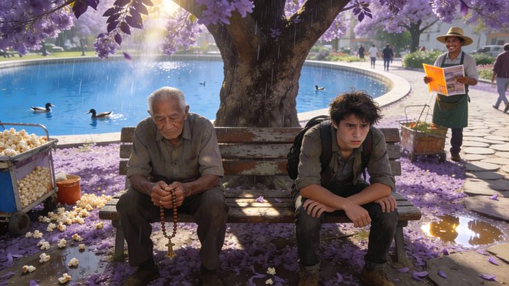 Em meio à conversa, notaram um velho sentado em um banco, envolto em um casaco surrado, observando o movimento da praça com um olhar distante. Carlos sentiu uma pontada no coração e disse: “Devemos oferecer um pouco do nosso calor a ele.”