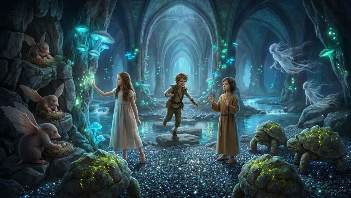 Luna, curiosa e sonhadora, colheu luz das paredes como quem colhe esperança. Tico, aventureiro e brincalhão, pulava sobre rochas ressonantes, rindo do barulho. Mira, sensível e atenta, caminhava devagar, percebendo os gestos das criaturas: o cuidado dos toupeiros alados ao carregar ninhadas, o respeito dos tecelões de névoa ao cruzar os caminhos alheios.