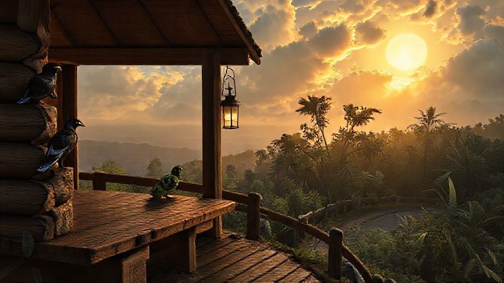 No alto do Posto de Guarda, uma varanda de madeira vigiava a curva do caminho e a borda da floresta. O Corvo (Observador) repousava no beiral como quem lê as linhas do vento; a Tartaruga (Paciente) aquecia-se junto à pedra, respirando devagar, enquanto a Lanterna (Iluminação) pendia de um prego, adormecida à espera da noite, e a Bússola (Direção) descansava sobre a mesa, com a agulha fiel apontando o norte que não engana. Ali, onde se vigia o que vai e o que vem, a vida parecia pronunciar uma oração silenciosa.